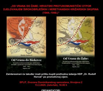 Hrvatska družba povjesničara „Dr. Rudolf Horvat“ u suradnji s brojnim lokalnim suorganizatorima poziva vas na predstavljanja dvije nove knjige koje pod naslovom „Od Vrana do Biokova: Hrvatski protukomunistički otpor djelovanjem imotskih i zapadnohercegovačkih križarskih skupina (1944.-1951.)” i „Od Vrana do Žabe: Hrvatski protukomunistički otpor djelovanjem širokobrijeških i neretvanskih križarskih skupina (1944.-1948.)” potpisuje dr. sc. Blanka Matković. Knjiga „Od Vrana do Biokova“ na preko tisuću stranica obuhvaća djelovanje križarskih skupina, križarskih organizacija i neformalnih jatačkih mreža na prostoru od linije Vran – Posušje – Imotski – Biokovo prema Kamešnici, Cetinskom kraju, Tomislavgradu, Kupresu do Rame. Knjiga „Od Vrana do Žabe“ na 700 stranica odnosi se na istu tematiku na liniji od Vrana, Posušja i Imotskog do Metkovića, planine Žabe, Neuma, Hutova, ...