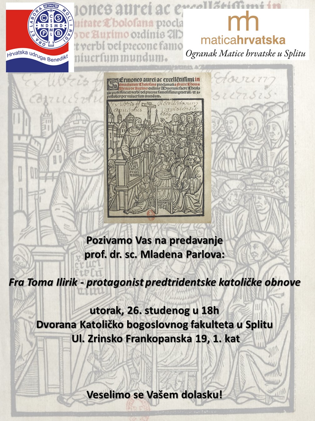 Fra Toma Ilirik – protagonist predtridentske katoličke obnove koje će se održati u utorak, 26. studenog s početkom u 18h u dvorani Katoličko bogoslovnog fakulteta u Splitu, Ul. Zrinsko Frankopanska 19, na 1. katu.