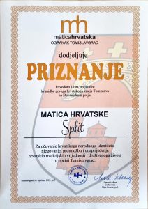 Priznanje MH Split stiglo je za očuvanje hrvatskoga narodnog identiteta, njegovanje, promidžbu i unaprjeđenje hrvatskih tradicijskih vrijednosti i društvenog života u općini Tomislavgrad.